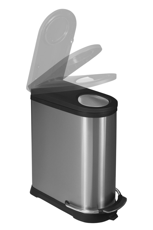 Smalle, halfronde pedaalemmer van mat RVS met 2 kunststof binnenemmers (16 en 20 ltr). Voorzien van gedempt kunststof deksel en stevig metalen pedaalsysteem. Aan de binnenzijde van het deksel is ruimte voor een carbonfilter om geurtjes te voorkomen. Fingerprint Proof.