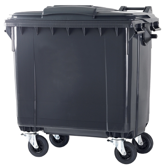 Kunststof container voorzien van plat deksel en 4 wielen.